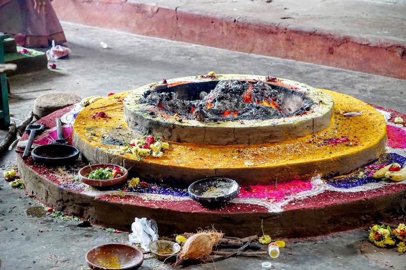 Getting past the gopura, we waded through a thick cloud of smoke. Looking around, we found a homa(होम) which must have ended within the past hour by looking at the homa pit.